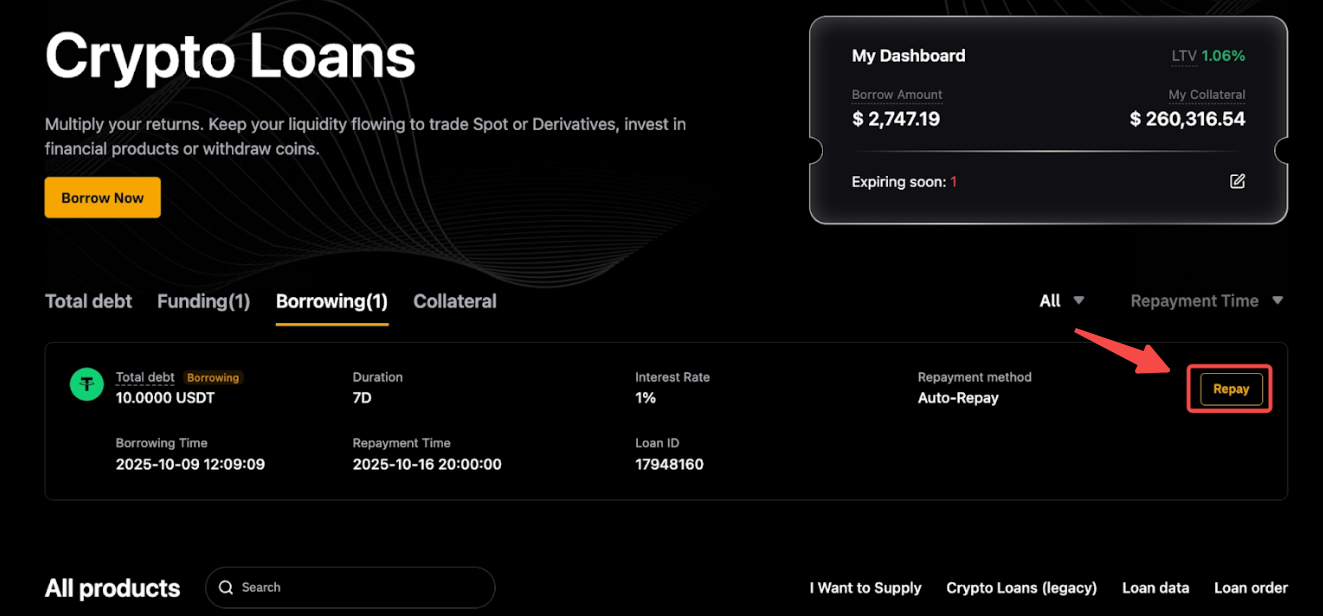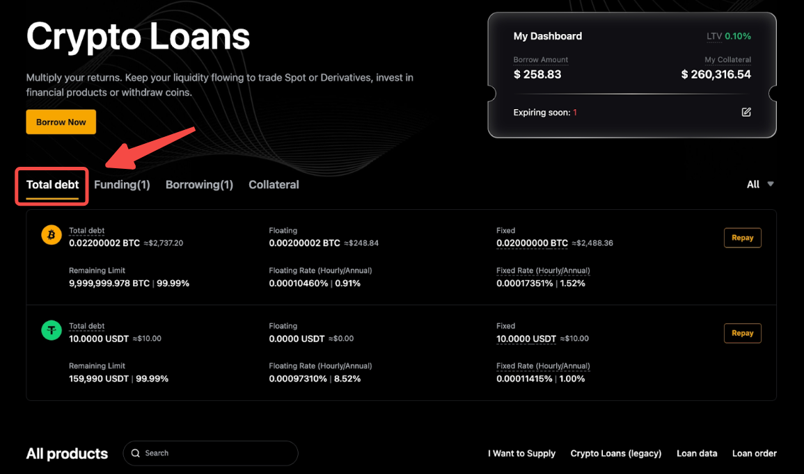 Si tienes órdenes activas realizadas antes del lanzamiento de los nuevos Préstamos Cripto, puedes administrarlas haciendo clic en Deuda total en la página de inicio de Préstamos Cripto. Seguirás pudiendo realizar reembolsos. Estas órdenes siguen las antiguas reglas de LTV y no se incluirán en los cálculos del nuevo sistema. Ten en cuenta que las nuevas órdenes de préstamo solo se pueden realizar en el nuevo sistema de Préstamos cripto.