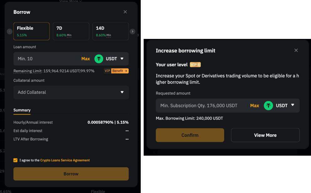 • Beneficio VIP: Para los usuarios VIP, puedes aumentar el límite de préstamo haciendo clic en Beneficio VIP.