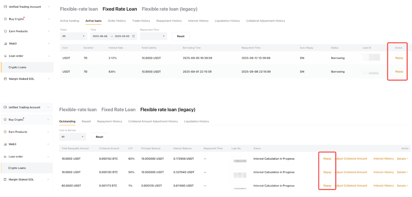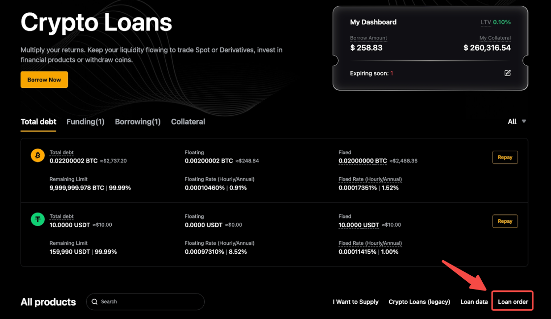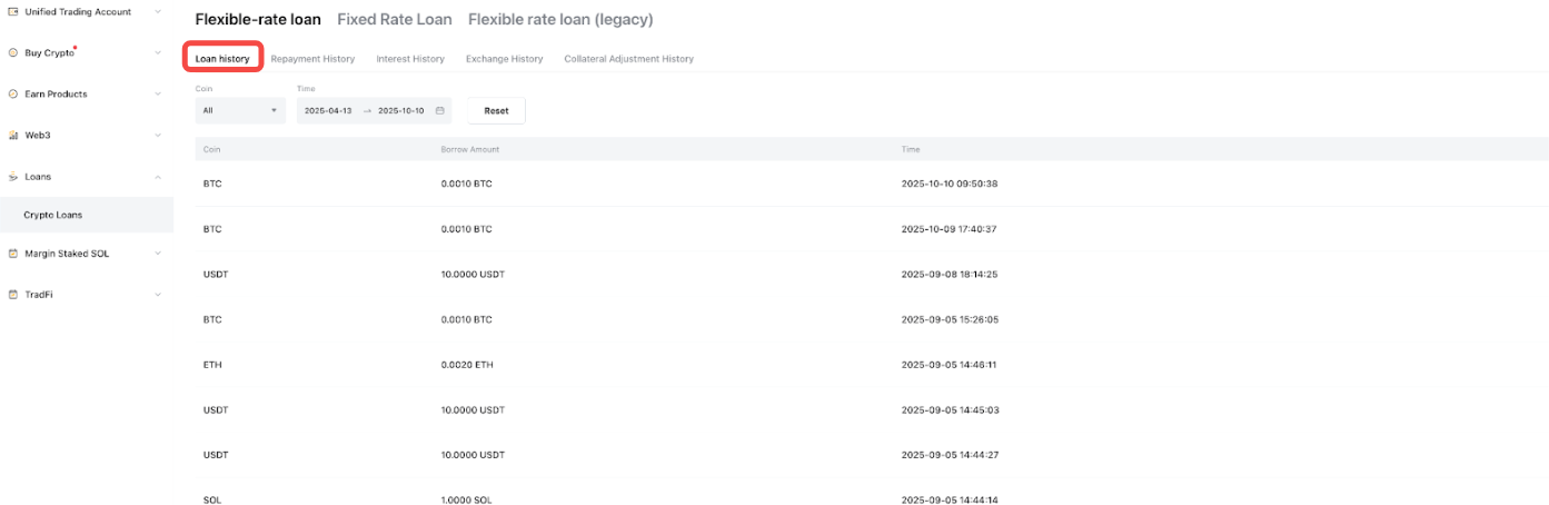 Para ver una lista completa de todas tus órdenes, haz clic en Orden de préstamo en el Panel de información general. Puedes ver todas las órdenes de Préstamos Cripto cambiando las pestañas del producto en la parte superior, incluido el Préstamo de Tasa Flexible, Préstamo (Fijo) y Préstamo de Tasa Flexible (Legacy), con información detallada sobre tu préstamo, reembolsos, intereses, garantía y más. También puedes filtrar por activo o tiempo para limitar los resultados.