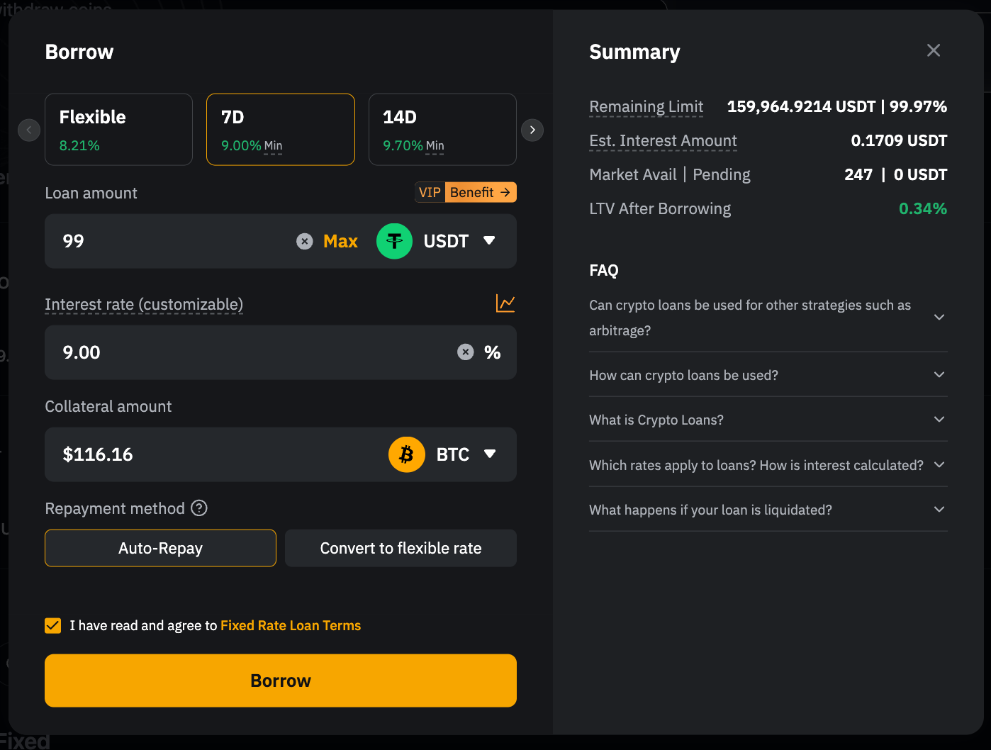 Aparecerá la ventana emergente del Préstamo a tasa flexible. Especifica los siguientes detalles y haz clic en Pedir prestado nuevamente: