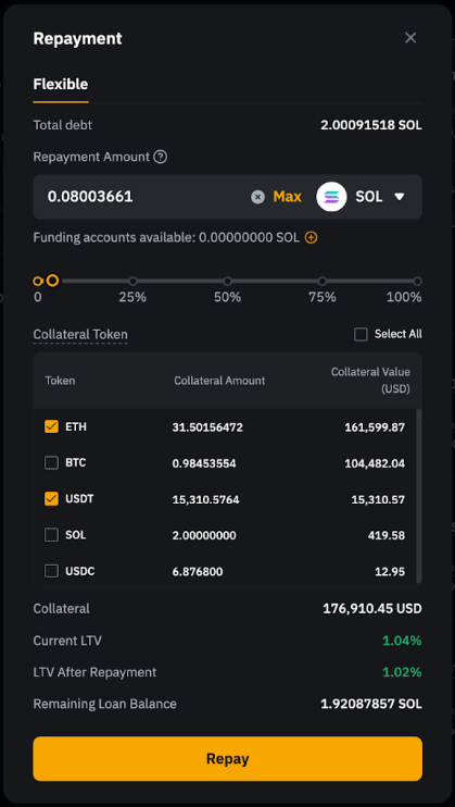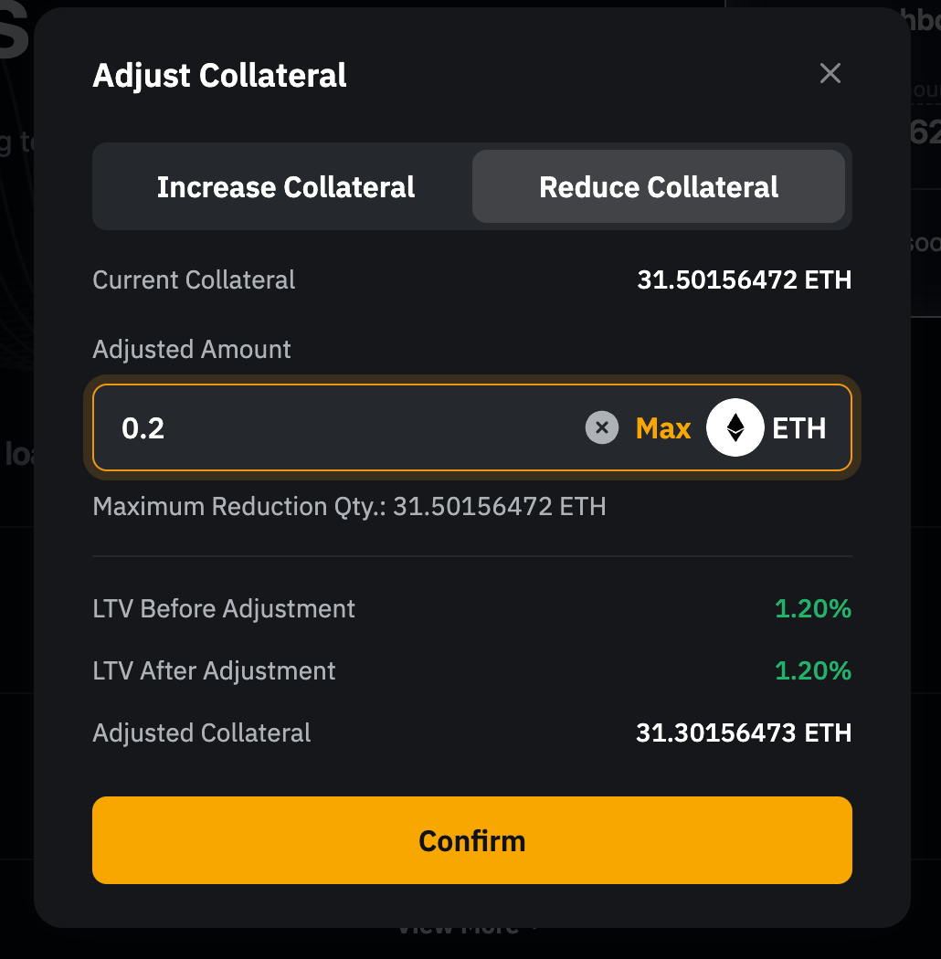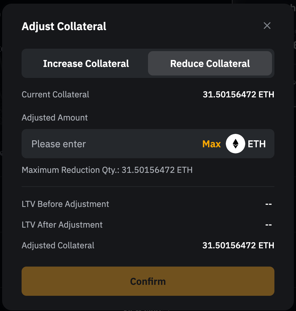 • Importe del préstamo: Haz clic en Max para pedir prestado el importe máximo permitido en función del valor de tu garantía y el límite de préstamo del activo.
