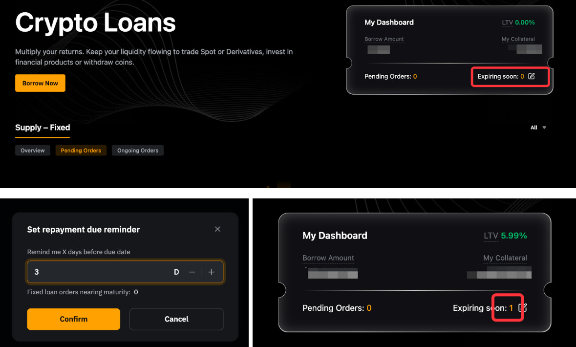 — También puedes habilitar un recordatorio de “pago pendiente” en la página de inicio del Préstamo cripto y haciendo clic en el icono de edición junto a Caduca pronto en Mi panel para establecer el número de días antes de la fecha de vencimiento. Una vez que venza un reembolso, el número de productos que vencen se mostrará junto a Caduca pronto.