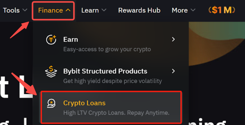 Paso 1: Inicia sesión en el sitio web de Bybit y haz clic en Finanzas → Préstamos cripto en la barra de navegación para acceder a la página Préstamos cripto.