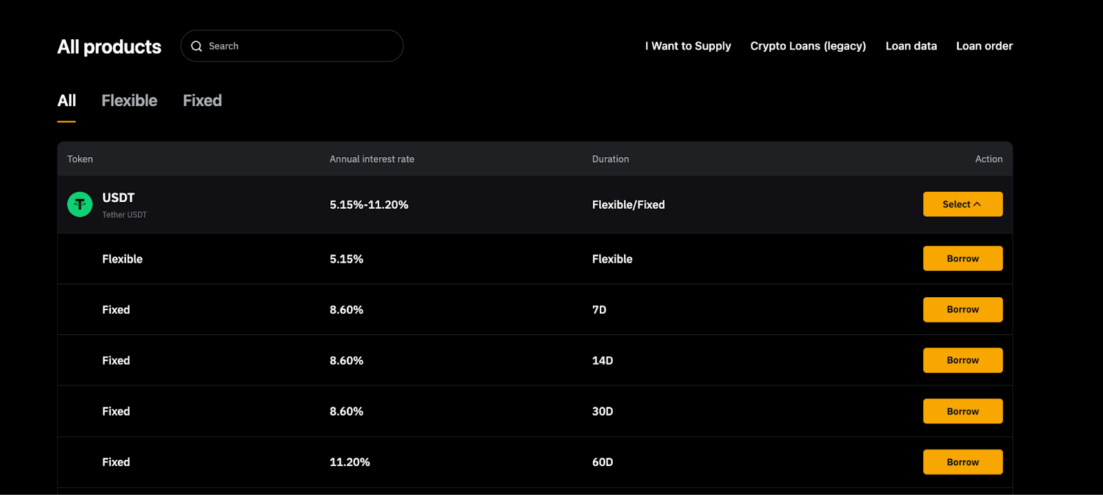 Paso 2: En Todos los productos, encontrarás opciones de préstamos a tasa fija y flexible. Selecciona o busca el activo que quieres pedir prestado para ver las duraciones disponibles y las tasas de interés correspondientes. Haz clic en Pedir prestado en la opción que más te convenga.