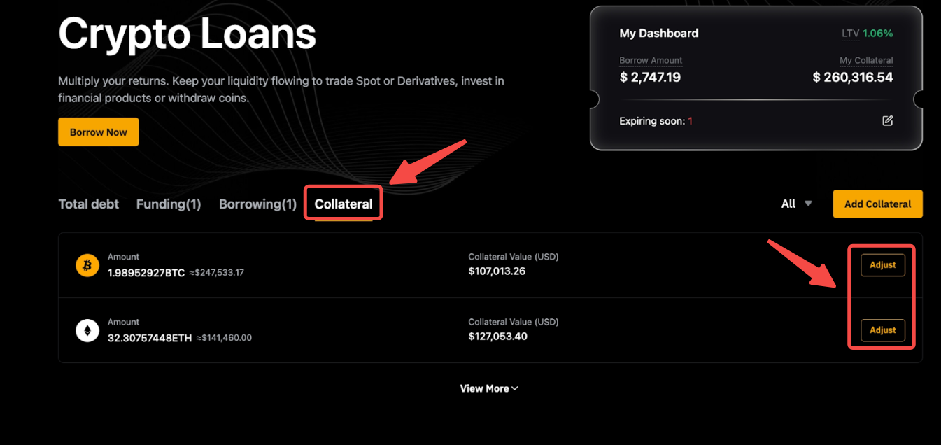 Para comprobar tus préstamos, ve a la página de inicio Préstamos cripto y verás una descripción general de tus préstamos, garantías y órdenes totales.