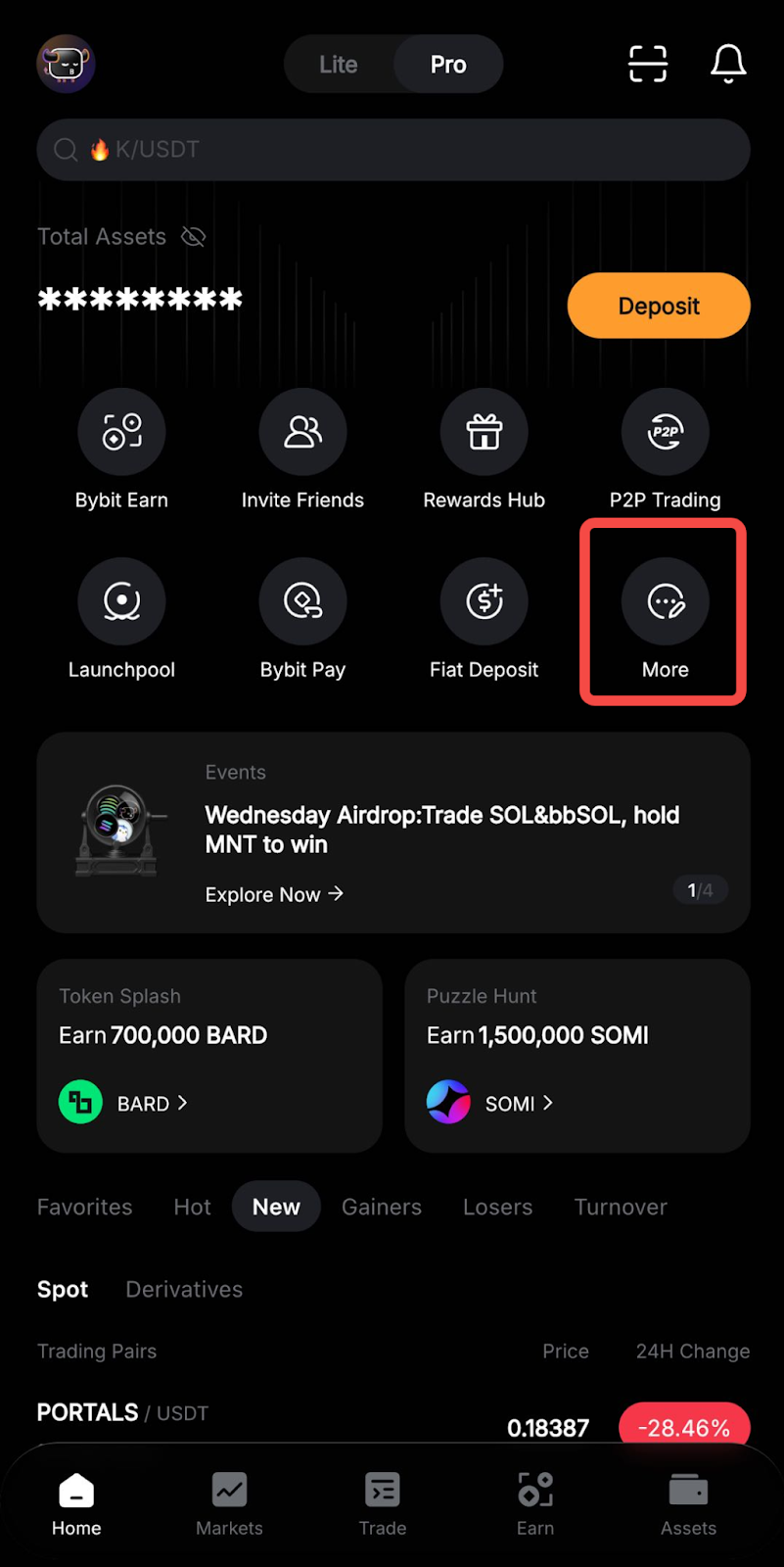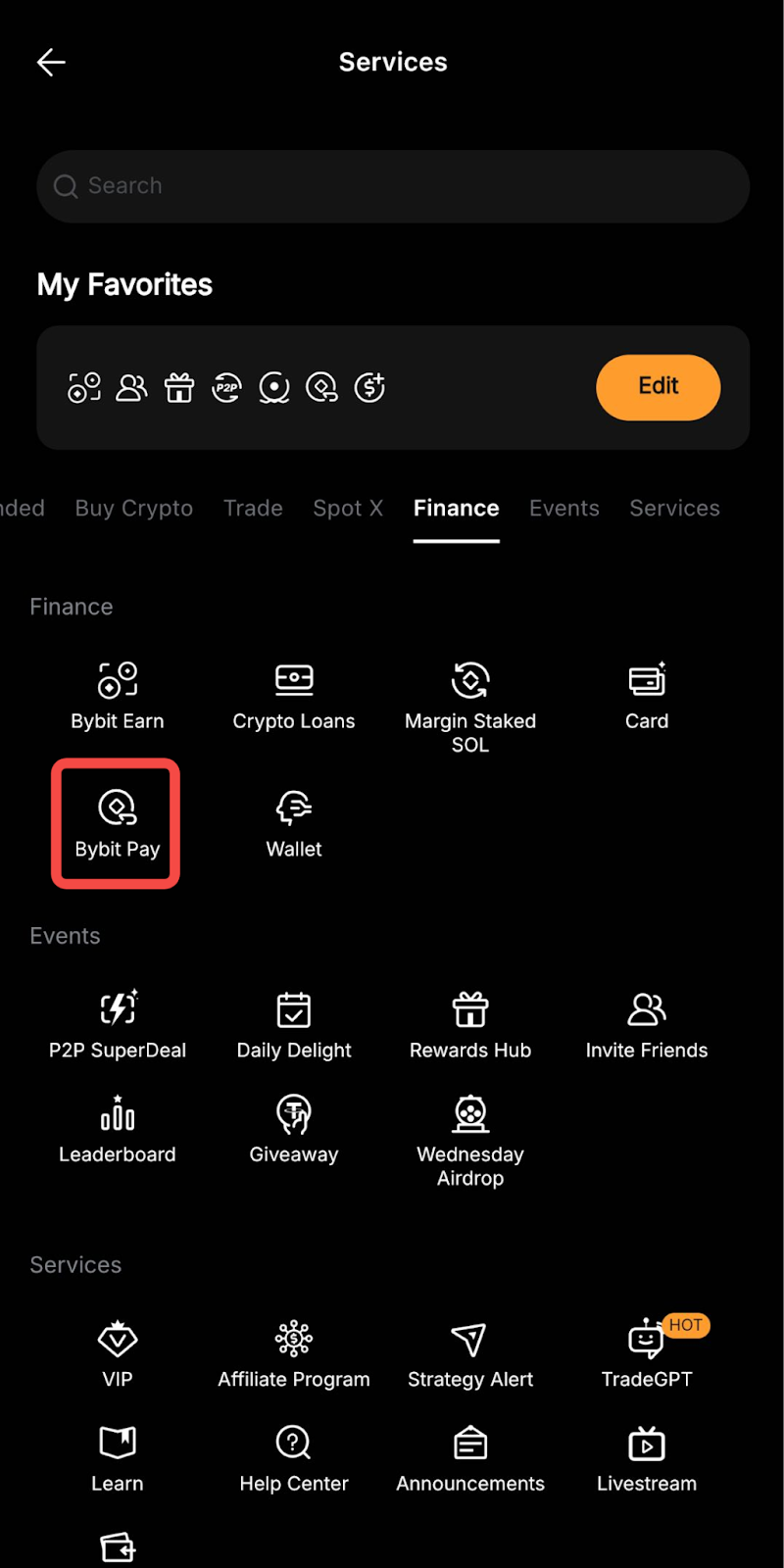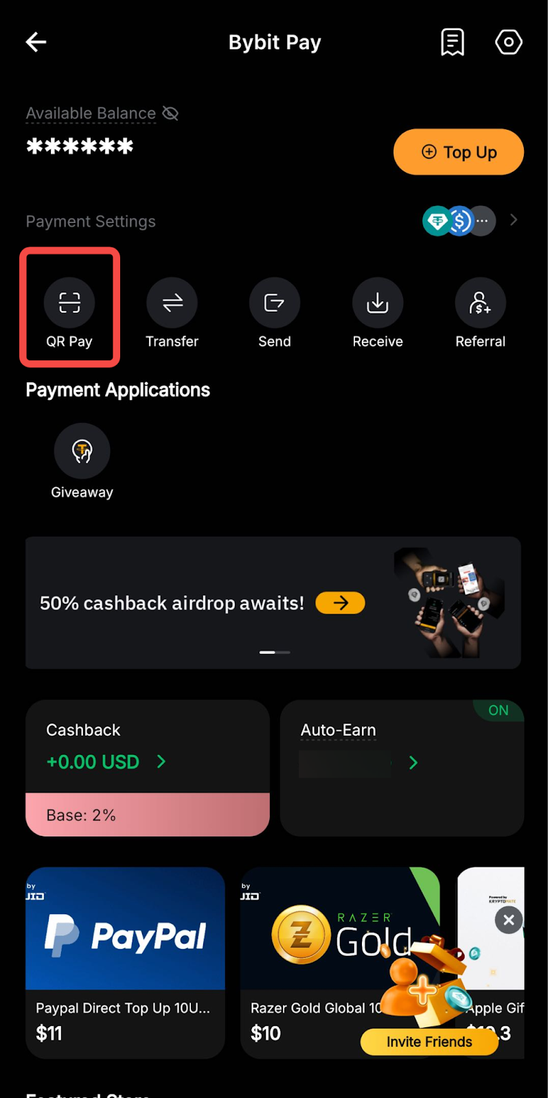 También puede hacer clic en Más → Bybit Pay. A continuación, pulsa Pago QR para abrir el escáner QR y escanear el código QR de pago.