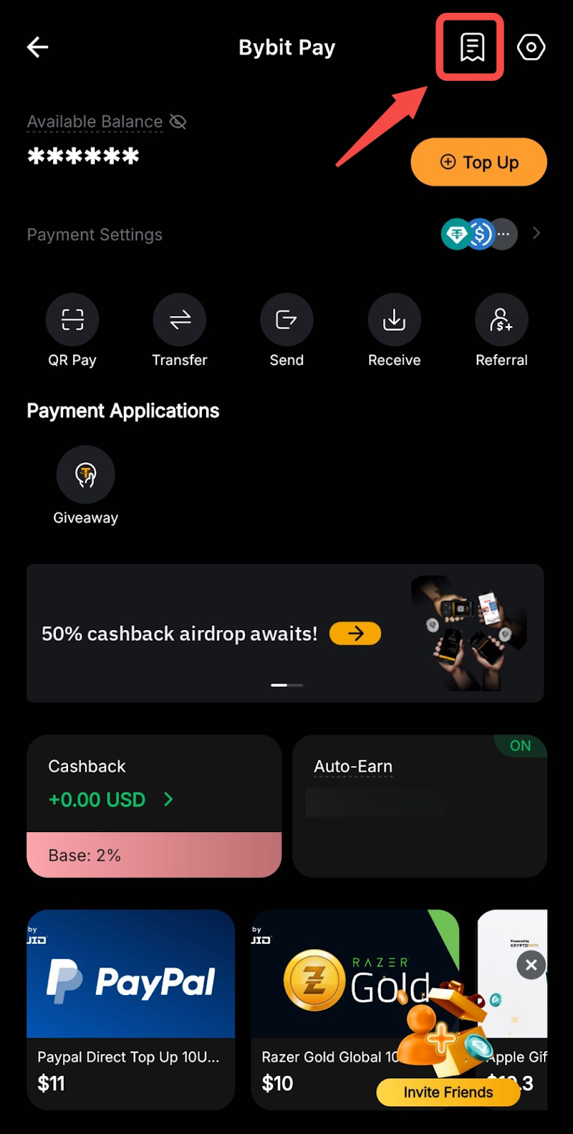 Para ver tu historial de pagos, puedes ir a la página Bybit Pay y hacer clic en el icono Paper en la esquina superior derecha.