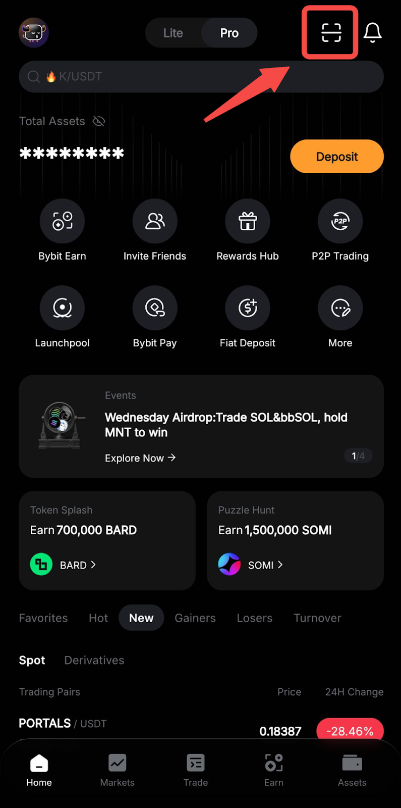 Paso 1: En la página de inicio de Bybit, toque el icono Escáner para abrir el escáner QR.