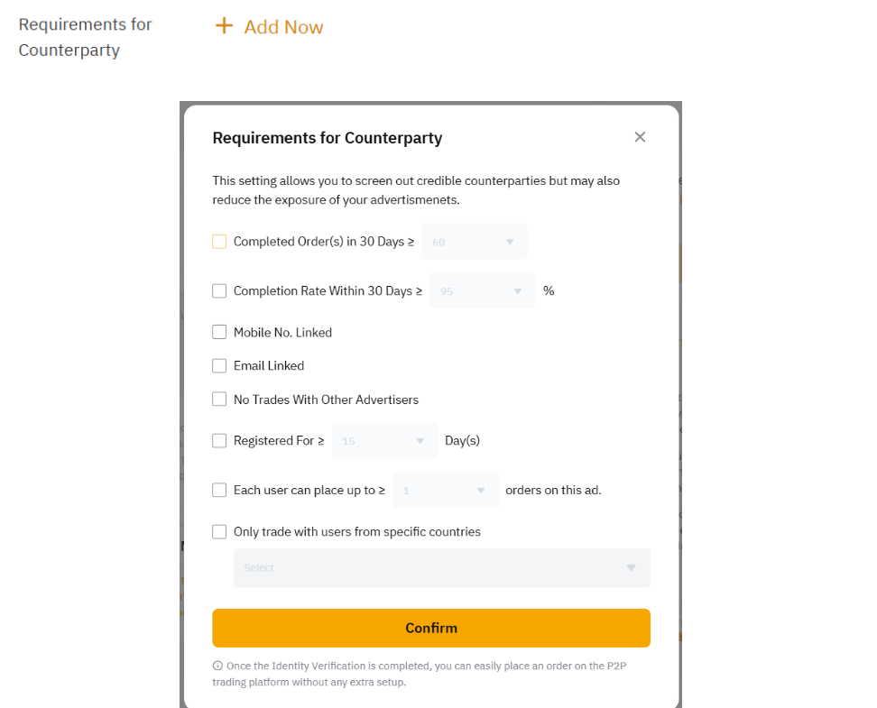 Si desea establecer requisitos para la contraparte de su anuncio, haga clic en Añadir ahora y se le pedirá que seleccione los requisitos que prefiera.