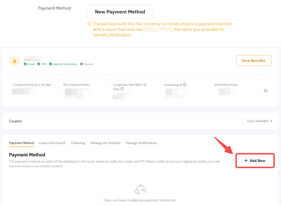 Haz clic en Nuevo método de pago → Agregar ahora para ir a Centro de usuarios P2P, donde podrás agregar tu método de pago.