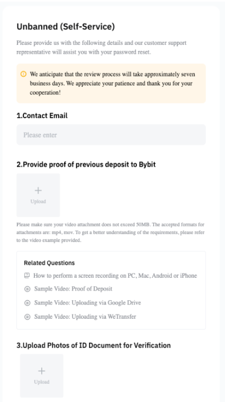 Paso 4: En la página de Auto-Servicio Desbloqueo, es posible que se te solicite que proporciones los siguientes detalles para que nuestro servicio de atención al cliente revise y procese tu solicitud de cancelación. Los documentos requeridos pueden variar para diferentes estados de cuenta. El proceso tardará aproximadamente entre 5 y 7 días hábiles.