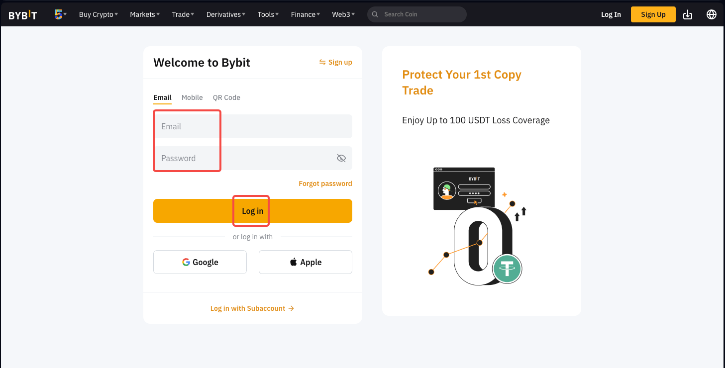 Paso 1: Ve a la página de inicio de sesión de la aplicación o web de Bybit e introduce las credenciales de la cuenta desactivada. A continuación, haz clic en Iniciar sesión.