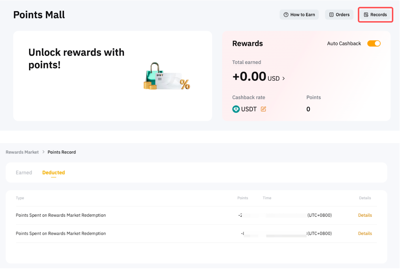 Haz clic en el icono Registros en la página Mercado de recompensas. Puedes ver tus puntos ganados y deducidos cambiando entre las pestañas de la página Registro de puntos.