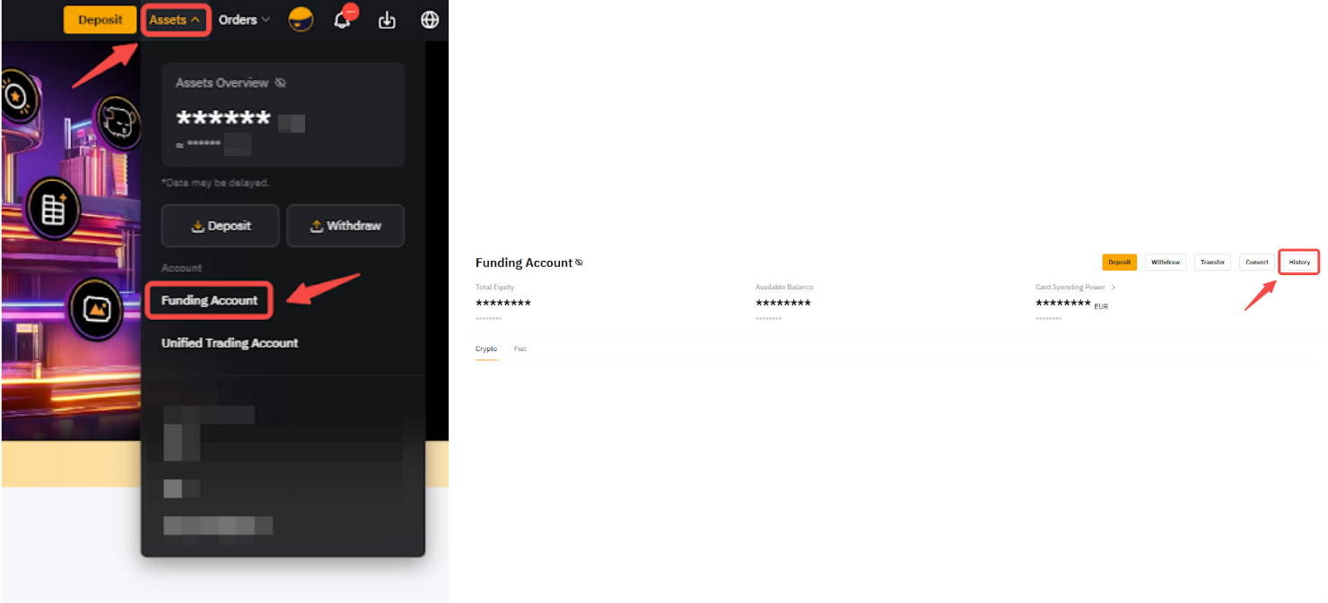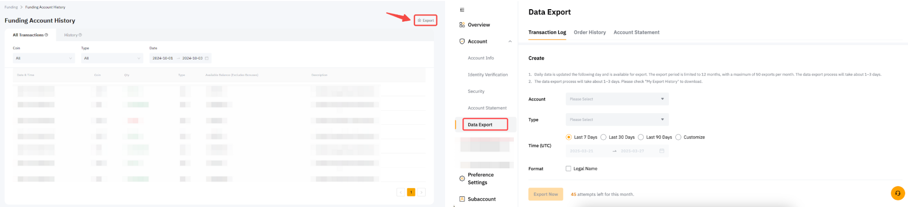 Paso 1: Haz clic en Activos → Cuenta de financiación → Historial → Exportar o ve a la página Exportación de datos.
