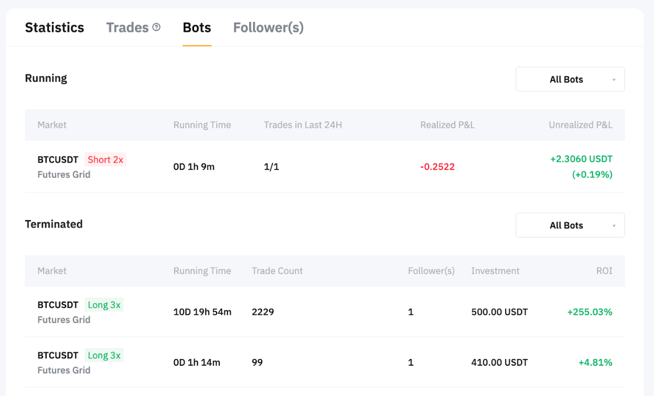 Puede acceder a los detalles tanto de los bots en ejecución como de los bots finalizados en Bots de negociación. Los datos específicos que se pueden ver son los siguientes: