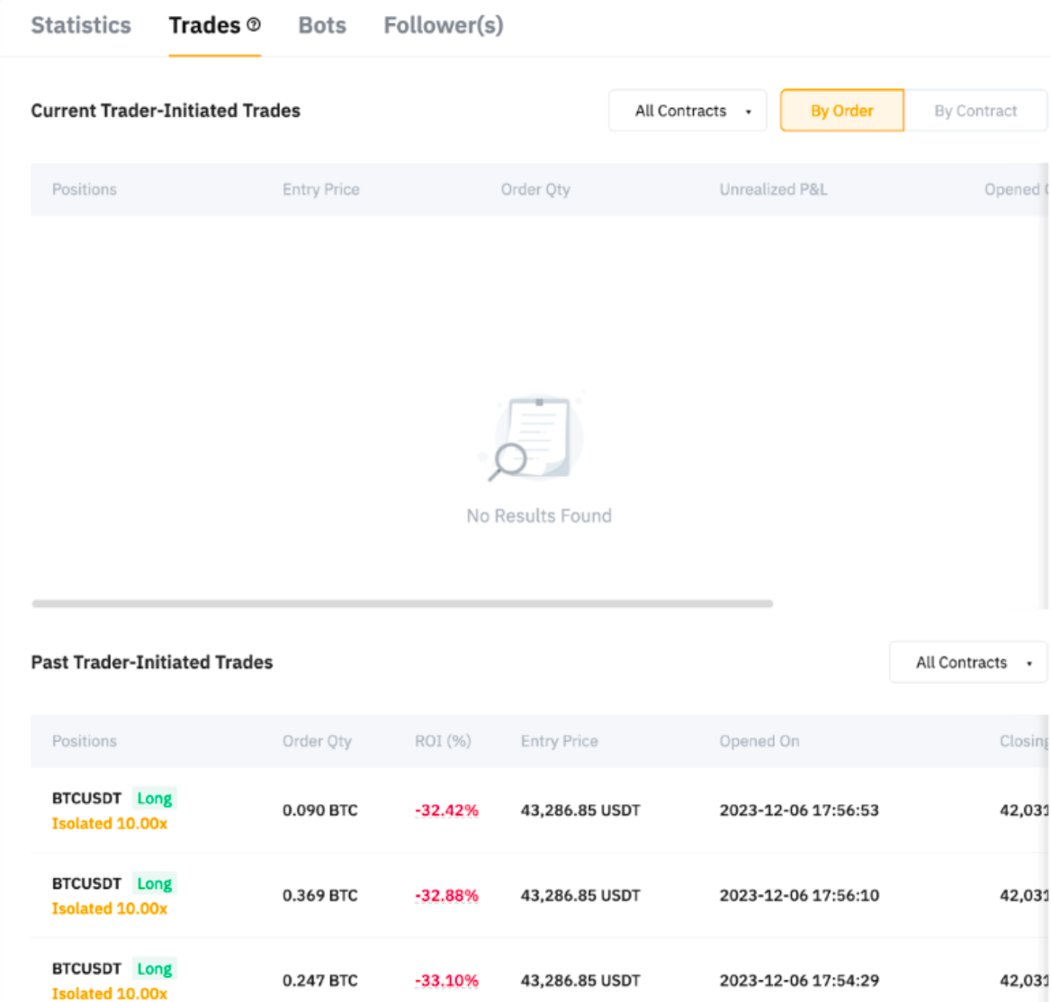 Trades pasados- Operaciones iniciadas: Posiciones, Cantidad de la orden, Precio de entrada, Precio de apertura, Precio de cierre, Tiempo de cierre, Margen, ROI (%) y Seguidor(es).