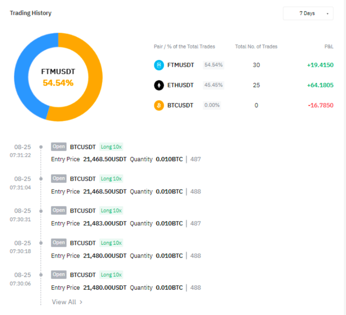 El 8 de enero de 2023, las pérdidas y ganancias no realizadas (UPL) del Trader B son de +2.300 USDT, y los resultados de las Trades de los últimos siete (7) días son los siguientes: