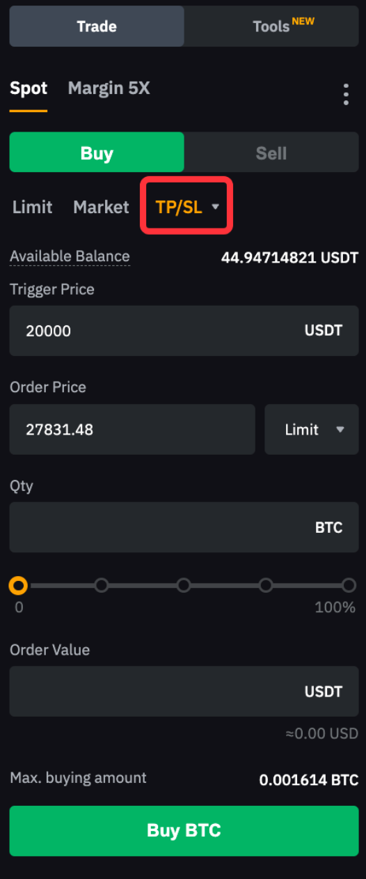 — Para la orden de compra TP/SL vinculada a tu orden de venta con límite en spot, el precio de activación TP debe ser inferior al precio de tu orden límite, mientras que el precio de activación SL debe ser superior al precio de tu orden límite.