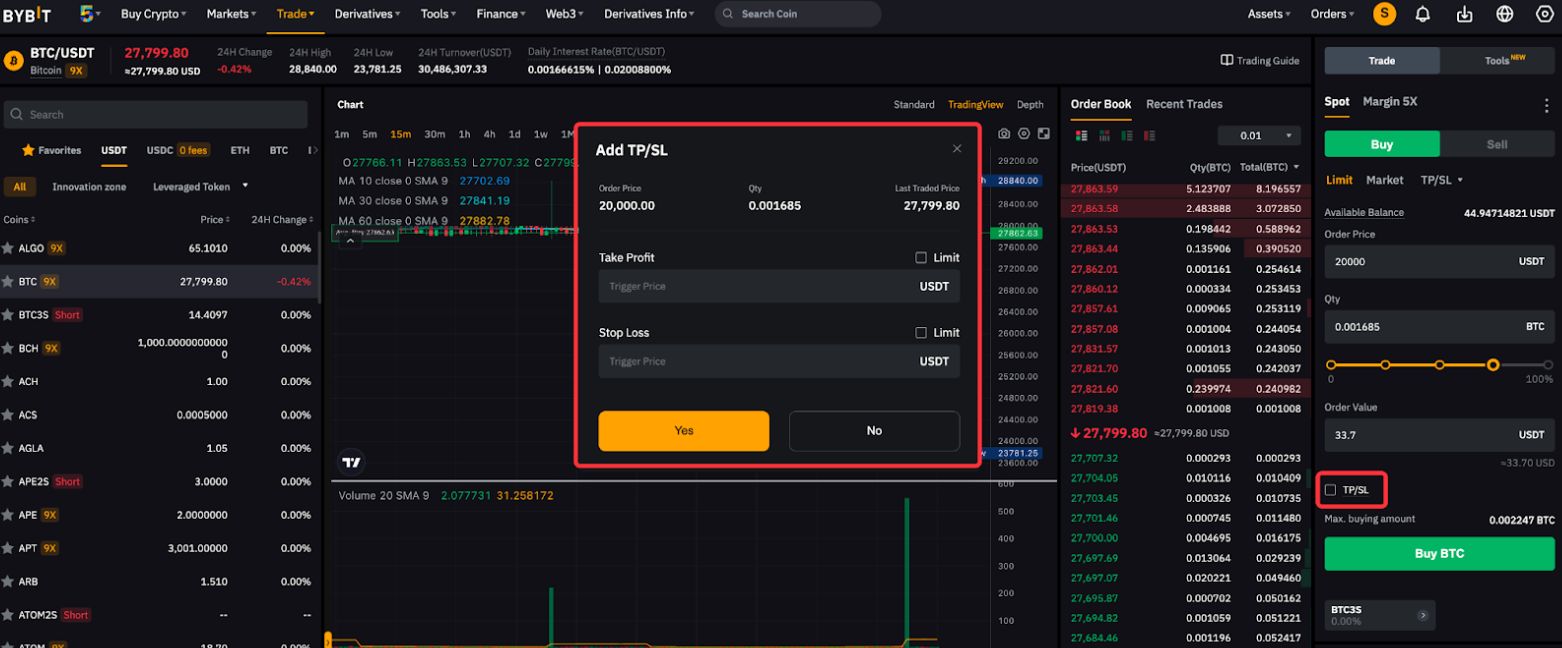 Además de configurar una orden límite, los traders tienen la opción de incluir un conjunto de órdenes TP o SL. Una vez ejecutada la orden límite, las órdenes TP y SL se envían automáticamente en función de los precios preestablecidos y la cantidad de la orden especificada.