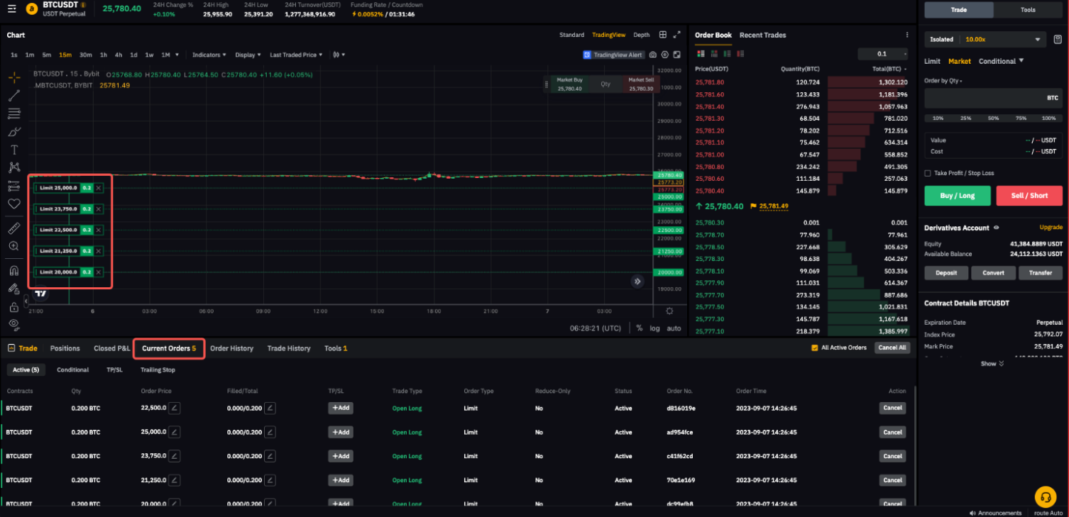 Después de enviar una orden escalada correctamente, tu gráfico se actualizará para reflejar tu orden escalada a diferentes variaciones de precio en consecuencia. Puedes comprobar tu orden límite desde la pestaña Orden actual.