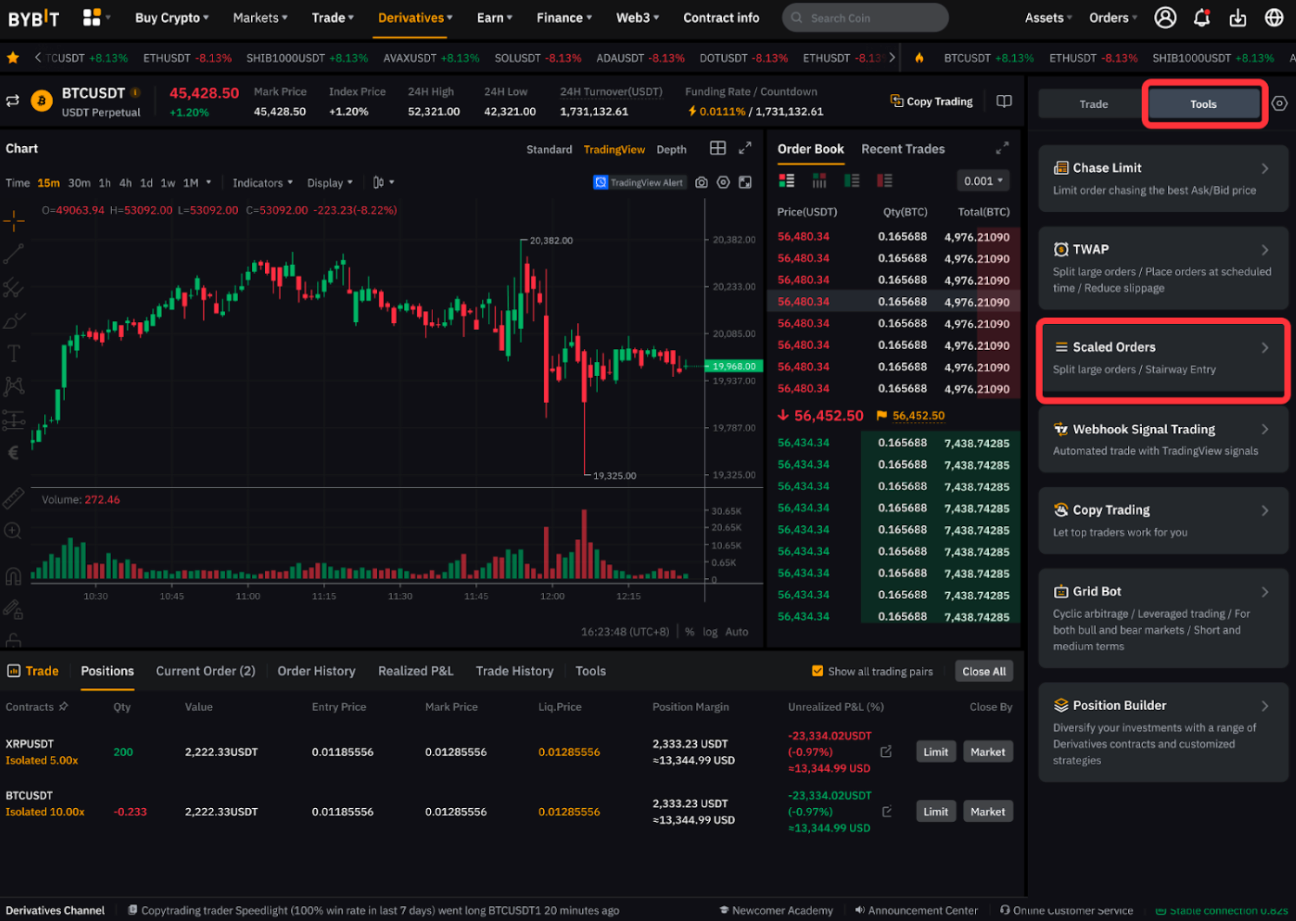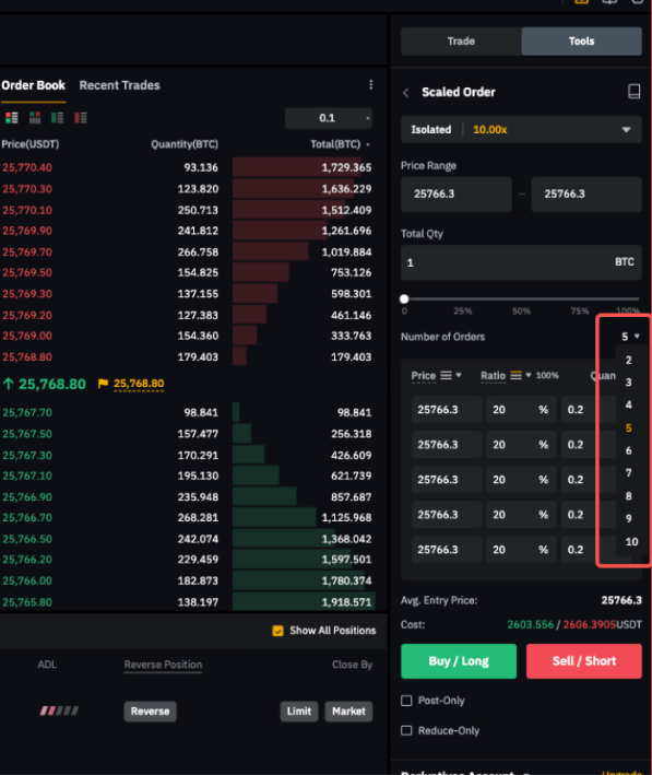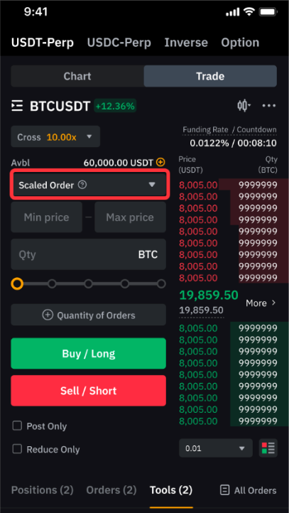 Paso 3: En PC, haz clic en la pestaña Herramientas y selecciona Orden escalada. Establece tu rango de precios preferido (el límite superior e inferior de tu orden escalada) y la cantidad total de tu orden escalada.
