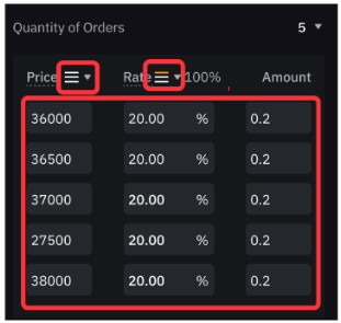 Ten en cuenta que la cantidad total mínima y máxima para una orden escalada es 10 veces el tamaño mínimo y máximo de la orden. Por ejemplo, el tamaño mínimo y máximo de la orden de BTCUSDT es de 0,001 BTC y 100 BTC respectivamente. Consecuentemente, la cantidad total mínima y máxima de orden en la orden escalada será de 0,01 BTC y 1000 BTC respectivamente.