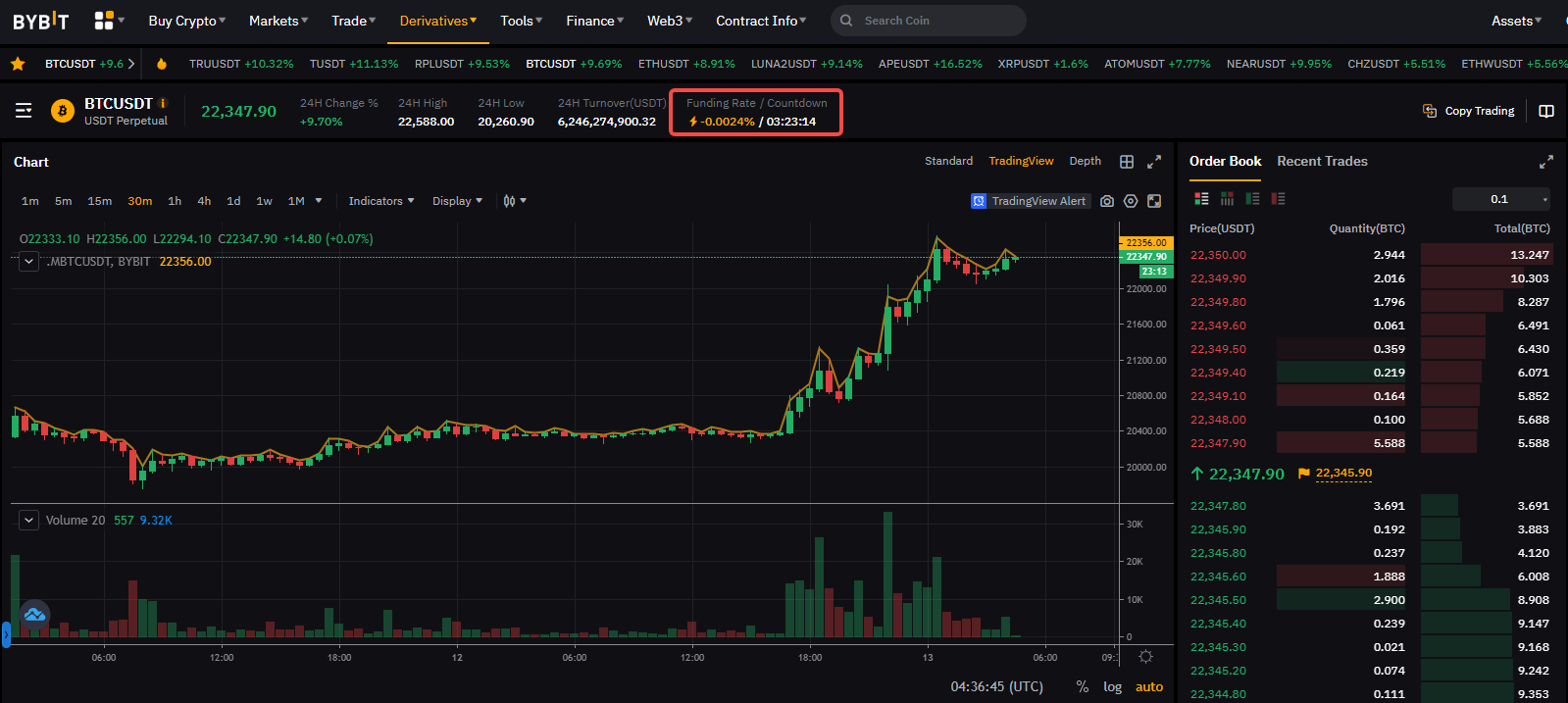 Чтобы привязать цену бессрочного контракта к спотовой цене, используется механизм финансирования, обеспечивающий привязку цены последней сделки на Bybit к глобальным стандартным спотовым ценам. Вкратце расскажем как это работает: если цена бессрочного контракта выше спотовой цены (т. е. ставка финансирования положительная), держатели лонг позиций платят комиссию за финансирование держателям шорт позиций. Это стимулирует трейдеров открывать больше шорт-позиций и снижает торговые цены, смещая их в сторону спотовой цены.