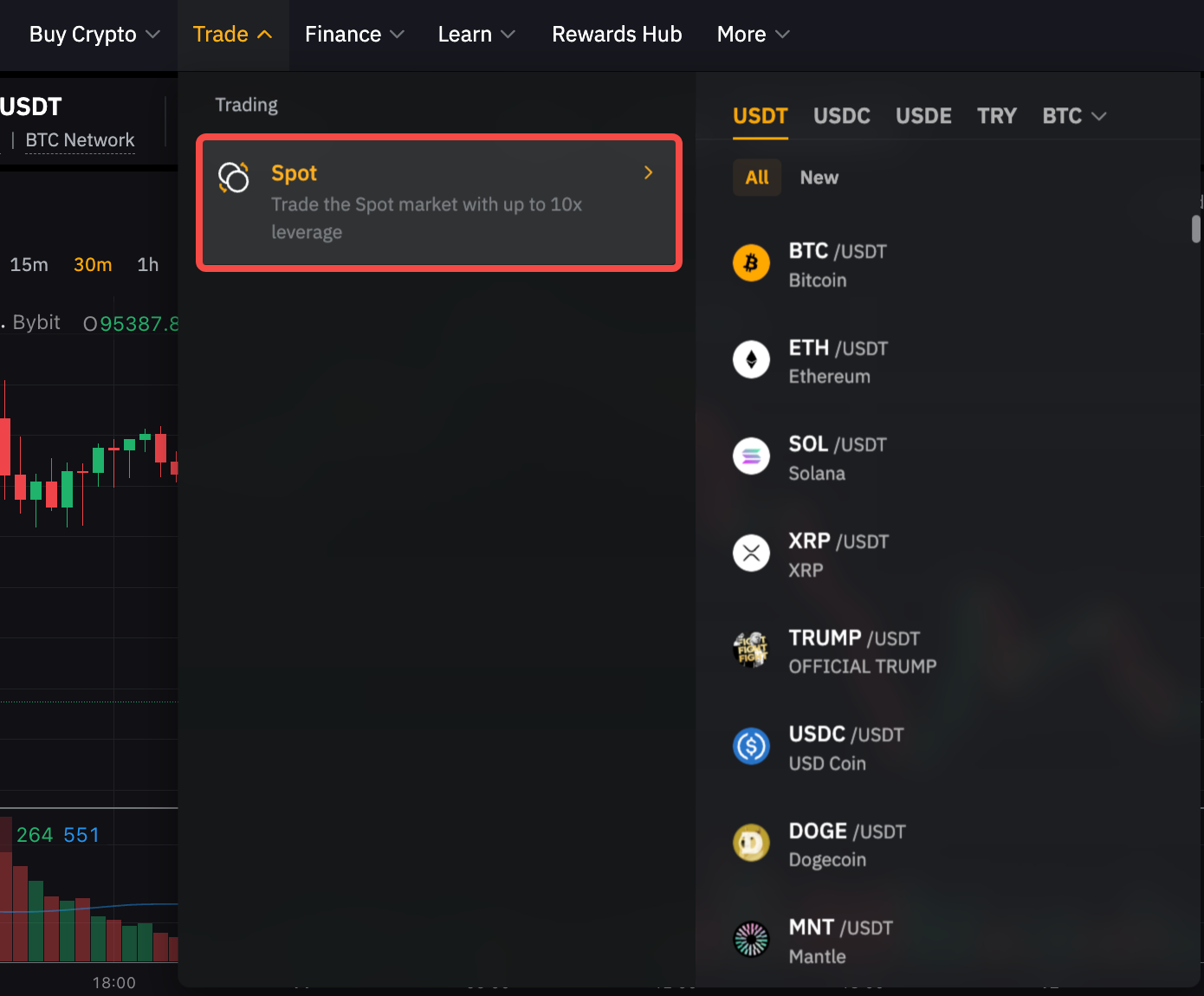Крок 1. Увійдіть у свій акаунт і натисніть Торгівля → Спот у верхній панелі навігації, щоб отримати доступ до сторінки спотової торгівлі.