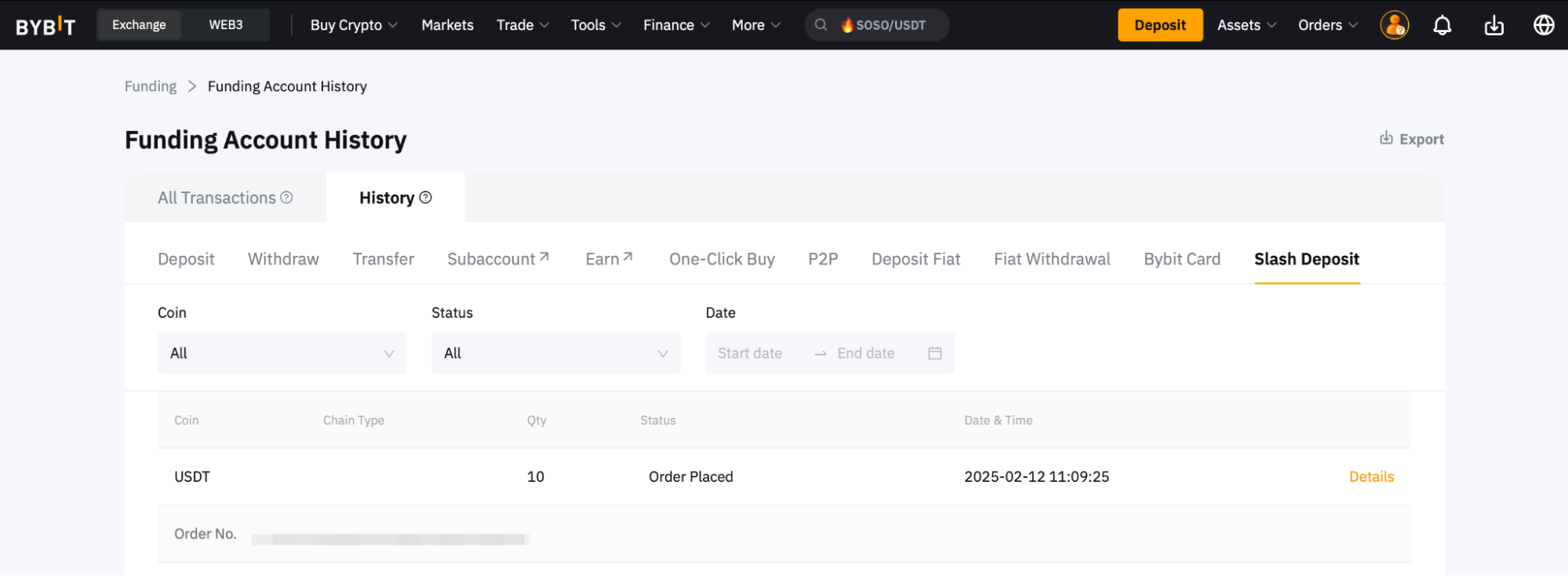 Крок 5. Після завершення транзакції ви можете переглянути запис про ордер на сторінці Історія акаунта фінансування. Щоб переглянути лише записи про Slash, просто натисніть Депозит Slash.